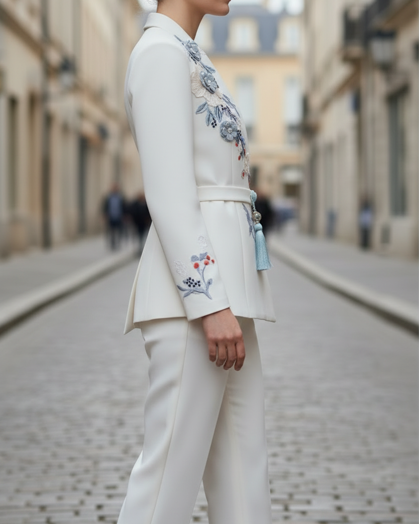 Chic White Blazer with Rose Embroidery